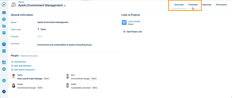 Select Teams in the Tempo sidebar, and then select your team's name to open the Overview.