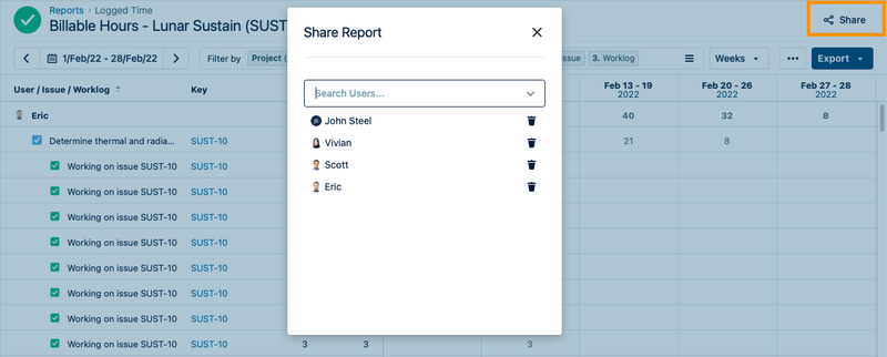 Click Create. The report is created, showing all the hours Logged by each team member to each Jira issue in this project.