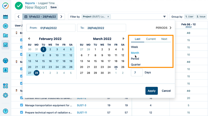 This creates a dynamic-period report where the data shown is always for the last month relative to the current date. Dynamic-period reports make it easy to create report templates for regularly-run reports.To view the billable hours, open the menu at the top-right, and select the Billable option. Only hours that were logged in the Billable hours field in the Log Time form appear in this Billable column.