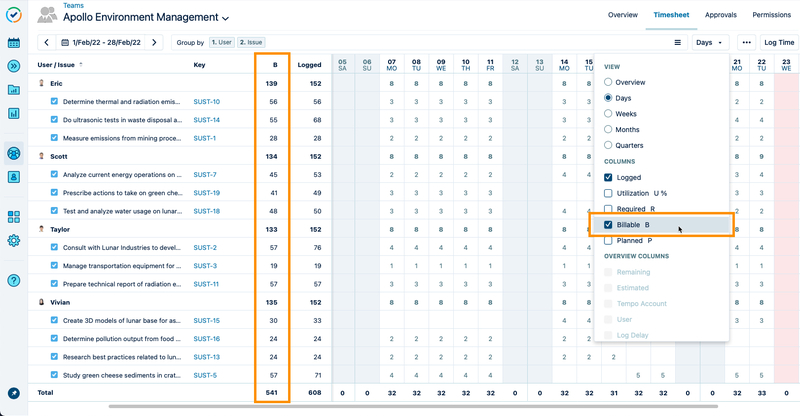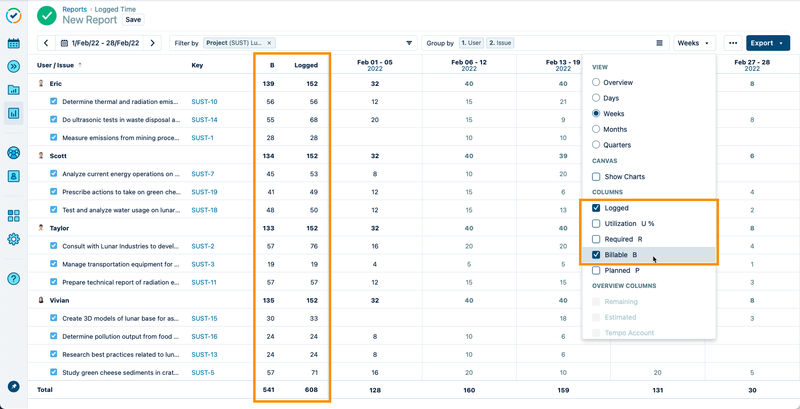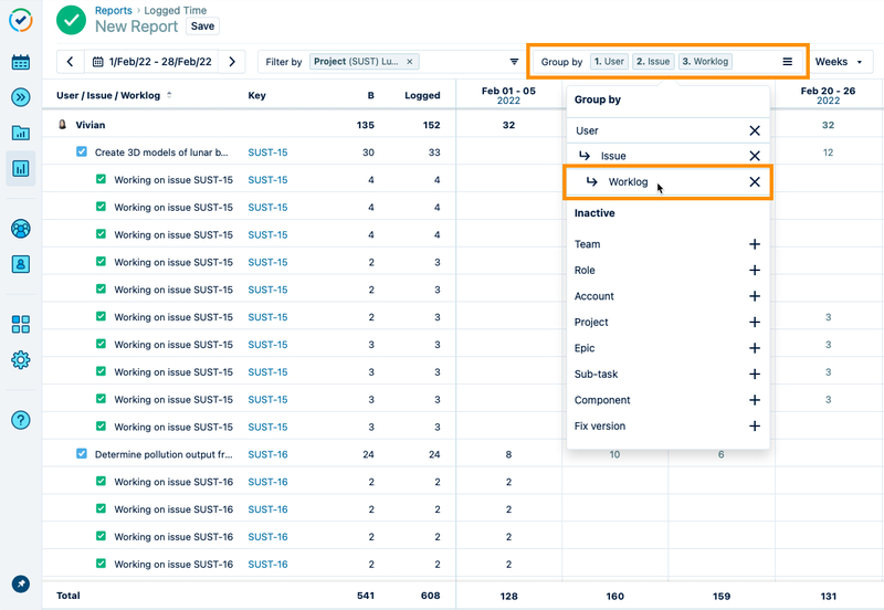 You can compare Logged versus Billable hours per team member and per issue, as well as the totals of each at the bottom of their columns.Click in the Group by field, select Worklog, and then click Apply to add details that your customer wants to see in the invoice, such as the individual worklogs for each team member on each issue.