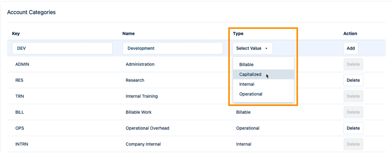 Account categories also let you identify accounts to be of a certain Type , and that's really important for filtering when you’re running reports later on. Four Types of categories are available: Billable, Capitalized, Internal, and Operational.