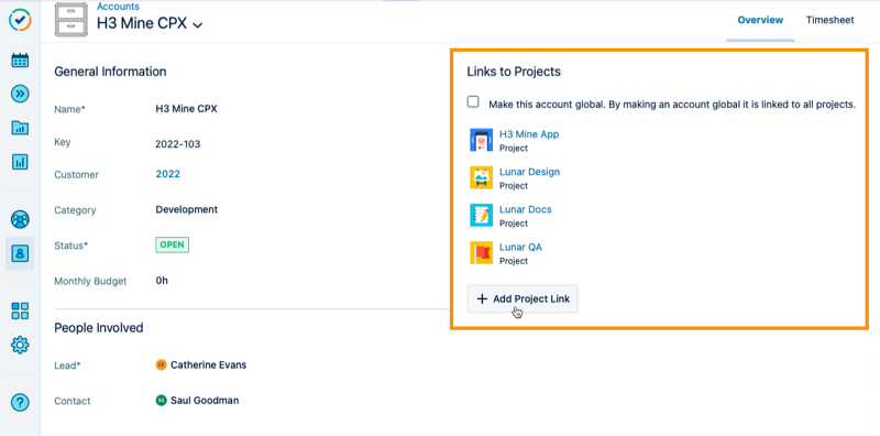 On the main Accounts page, click the account name to which you want to link Jira projects. Then on the account's information page, click + Add Project Link on the right and select a Jira project from the dropdown.