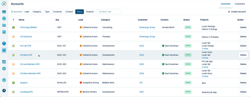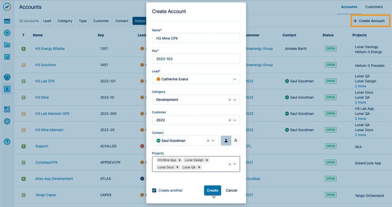 Now Catherine is ready to create two new accounts for tracking work as either Capex and Opex. These are the accounts to which the teams will log their time.