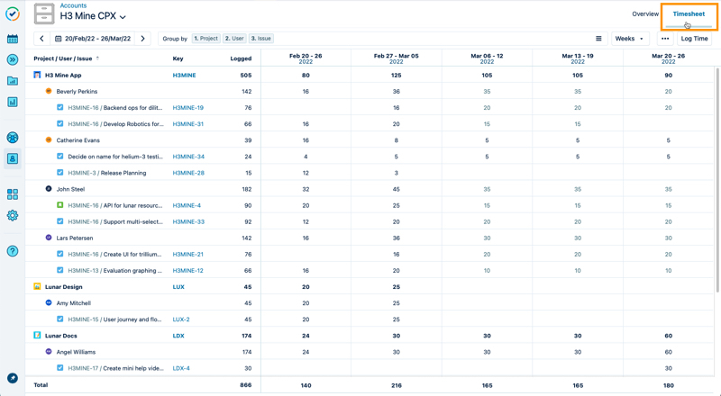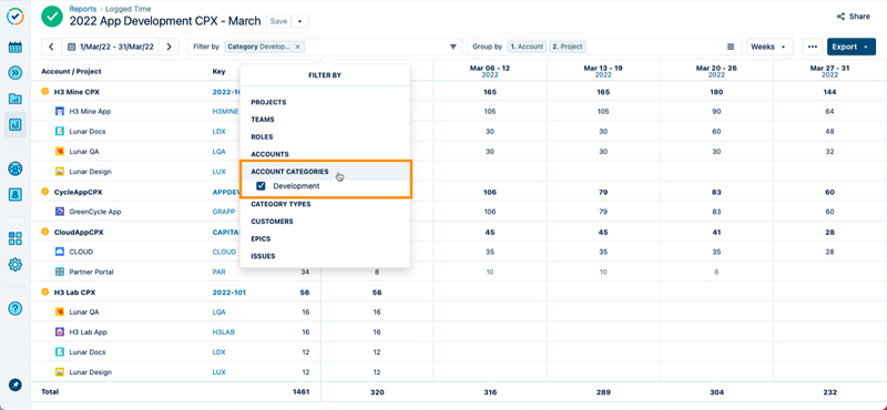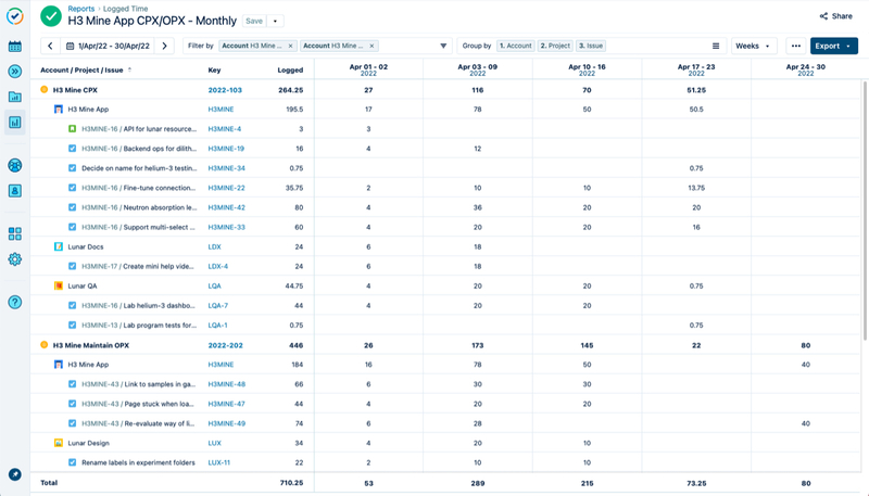 In the Group by field, select Account, Project, and Issue. This way, the time logged to each Jira issue is grouped separately into the two accounts: Capex and Opex with each project listed beneath it.