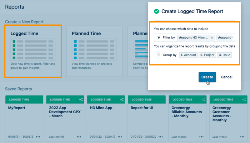 For the first report: In the Create Logged Time Report wizard, select Account in the Filter by field and check the H3 Mine CPX and H3 Mine Maintain OPX accounts in this list.