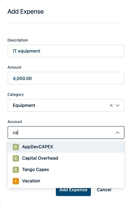 Start typing to see a list of available Tempo accounts, then keep typing to filter. Archived accounts are not displayed.Click Add Expense to add or Update to save the changes.