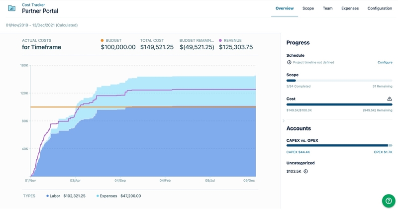 Tempo accounts that are categorized as Capital Expenditures (CAPEX) or Operating Expenses (OPEX) can be tracked in Financial Manager. Jira issues and Tempo worklogs that are associated with these accounts are calculated based on the logged hours and the user rates defined in Financial Manager. Those calculated totals are displayed in a side panel that compares CAPEX vs OPEX activities.