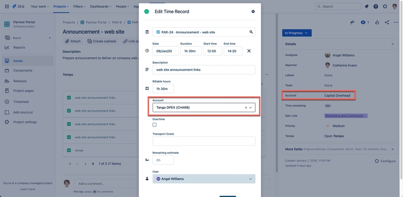 If no accounts are associated to the worklog, then the account associated to the issue is used in the calculations.To change the Account in the worklog, click to select from a list of available accounts.