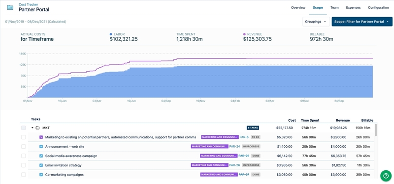 In the Scope tab, a breakdown of worklogs and their associated account and customer information can be obtained in a .CSV file that exports the labor costs exported from the Scope drop-down.