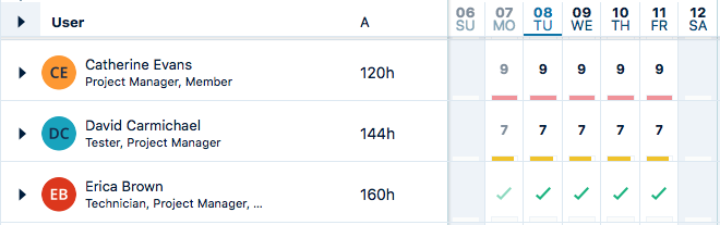 The main calendar on the right side of the Resource Planning view is where you can see the total number of hours that each individual is scheduled to work on each day. The number of working hours available for each resource is according to their Workload scheme, such as 8 hours per day.