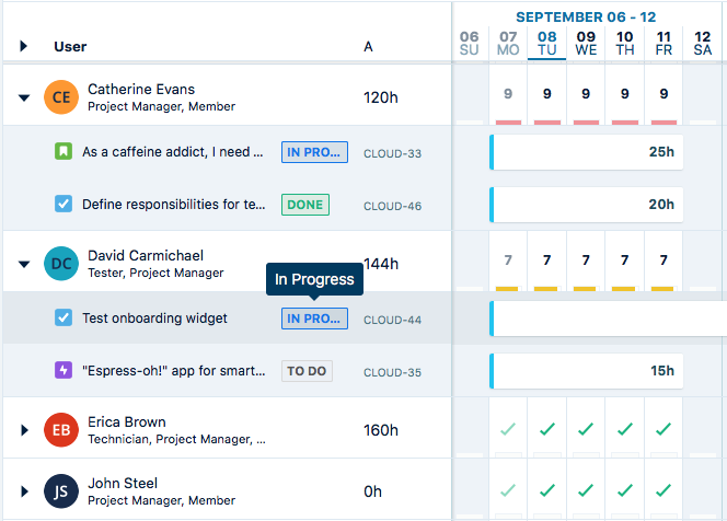 When a resource's plans are expanded, you can see the plans on each Jira issue and that issue's current workflow status, such as TO DO, IN PROGRESS, or DONE. The statuses that are displayed depend on how your Jira instance is configured.