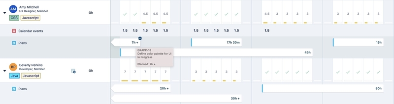 Hover-over the plans in the lanes to see the name of the Jira issue they represent and the number of hours.