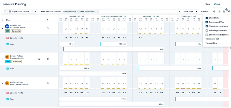 When planning for a large team you can use the compressed mode to see all plans and all calendar events without scrolling down multiple lines of Jira issues. When compressed, Jira issues are summarized under each resource name. Plans and calendar events are collapsed to take less vertical space making it possible to list all plans and events on a single page at a time.