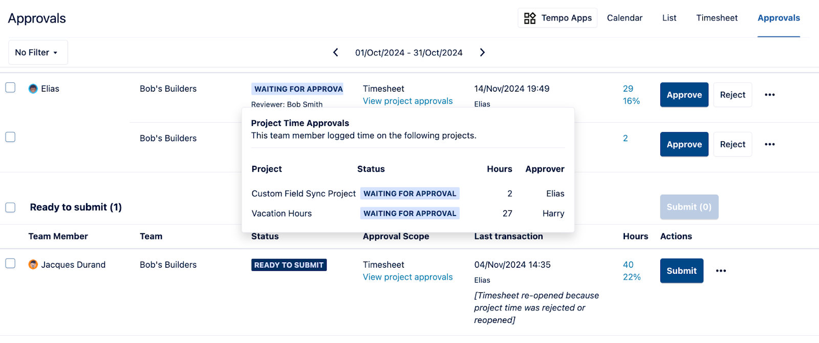 If there are project approvals associated to a timesheet, Team Leads can get an overview by clicking on View project approvals.