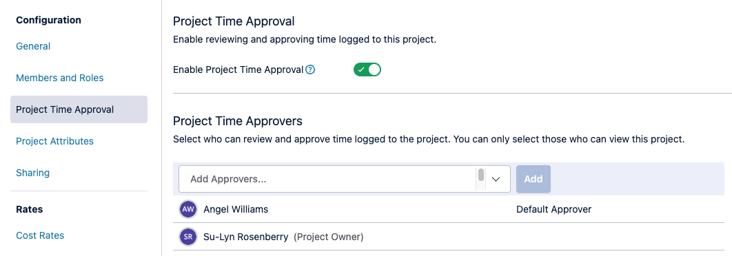 You can add backup approvers for projects in your project's configuration. The default approver is notified when project time needs to be approved, but any approver can approve or reject project time from the Approvals tab in either their project or in My Work. Approvers must have the Viewer role in the project.