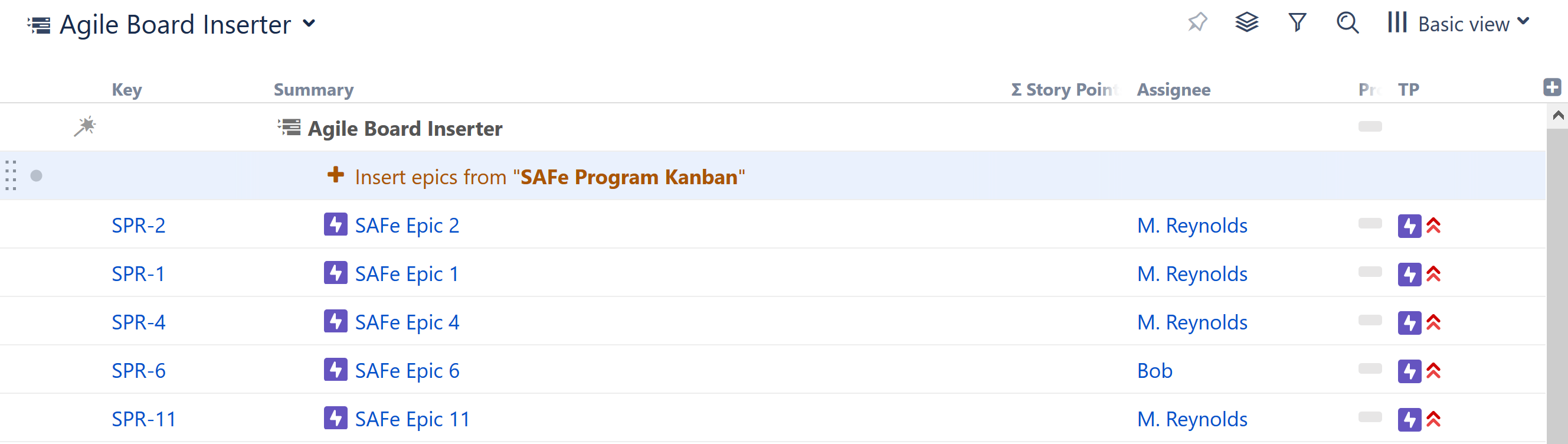 Once you've made your selection, click Apply. The inserter should now appear as a new row in your structure, with the added epics or issues placed below it.