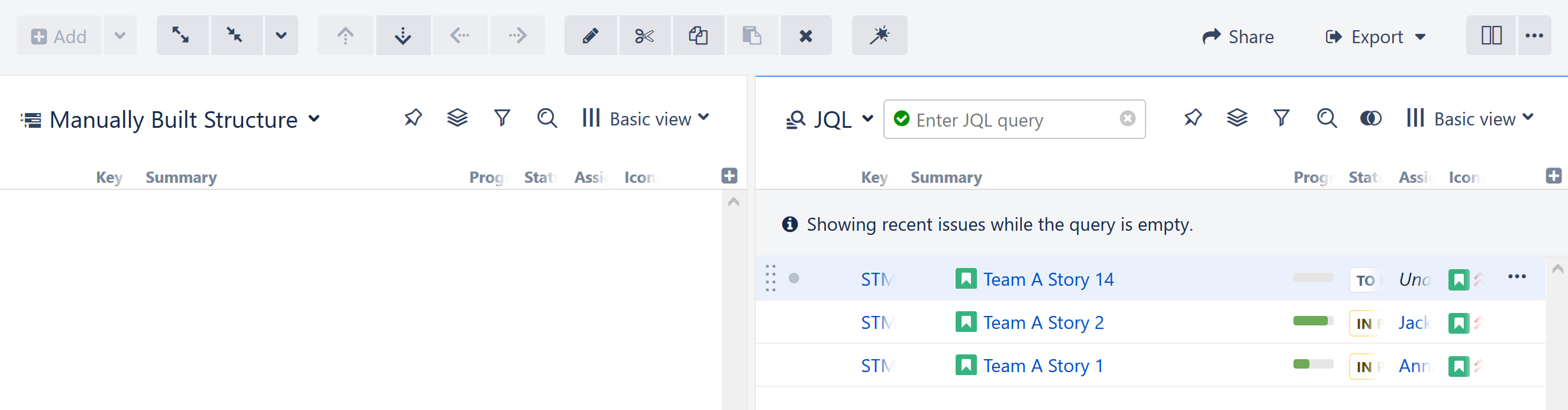 Either of these methods will open a second panel to the right of your structure. In this panel, you can enter a JQL query to search for issues you may want to add to your structure.
