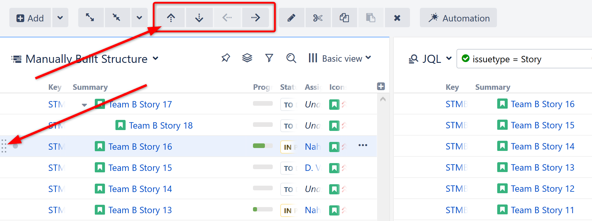 Building a structure manually allows you complete freedom in terms of choosing only the issues you want to include within your structure and arranging (or rearranging) them to your exact needs. When you add items to a structure manually, their position is stored within the Structure app itself – so you're free to move things anywhere you like, without affecting the issues in Jira.