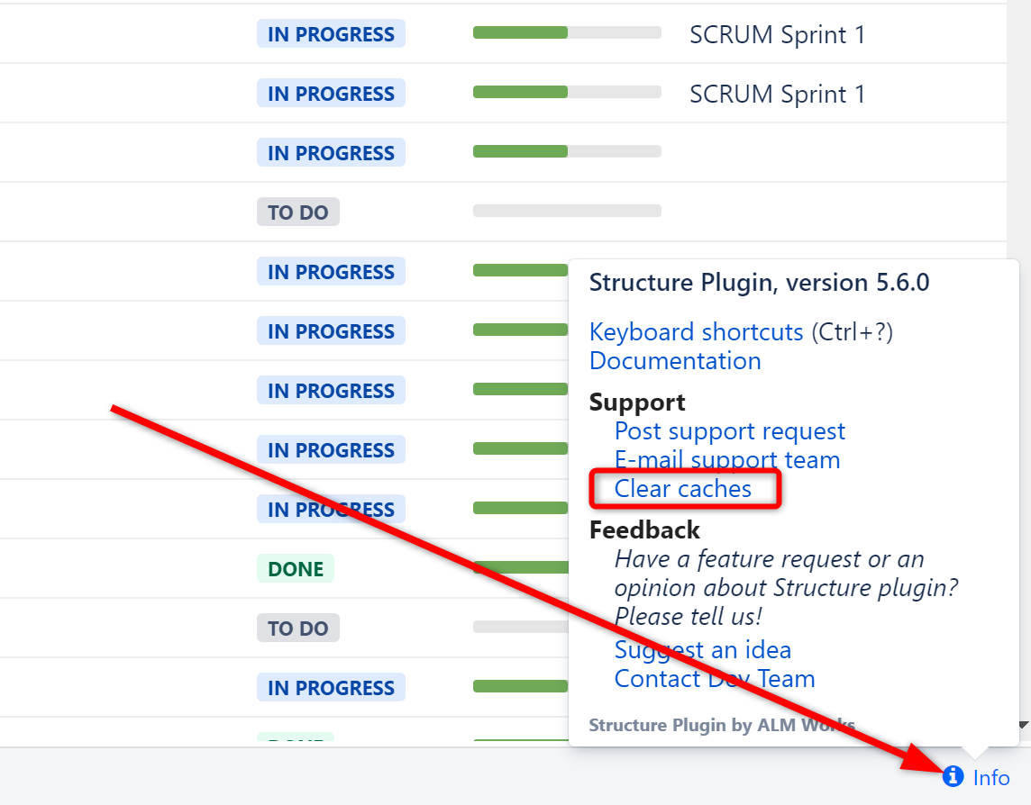 The Clear caches option is also available to admins and Structure users via the Info pop-up in the bottom right corner of the Structure panel.