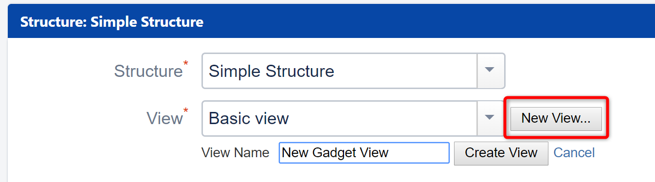 Select a View. Click arrow down to choose from views associated with the selected structure, start typing and let Structure suggest matching views, or create a new view. The selected view determines which columns the gadget displays. (You will be able to adjust the view later.)