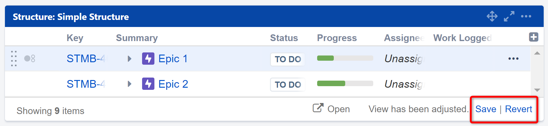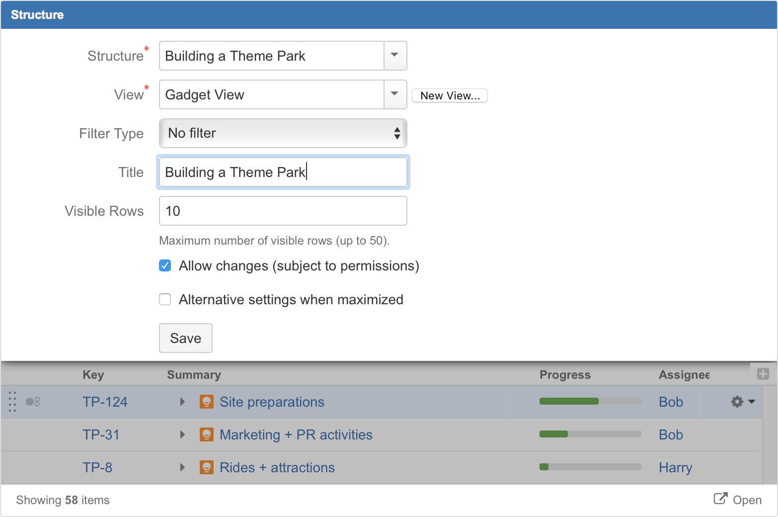 Click the Save link will apply all the changes you have made to the existing view. The view will be updated everywhere it is in use, in the gadget, on Structure Board, etc. It will also impact all other users with access to that view.