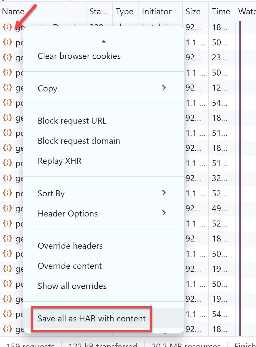 - After the problem has been reproduced, right-click on the Name column in the Network tab and choose either Save all as HAR or Copy all as HAR