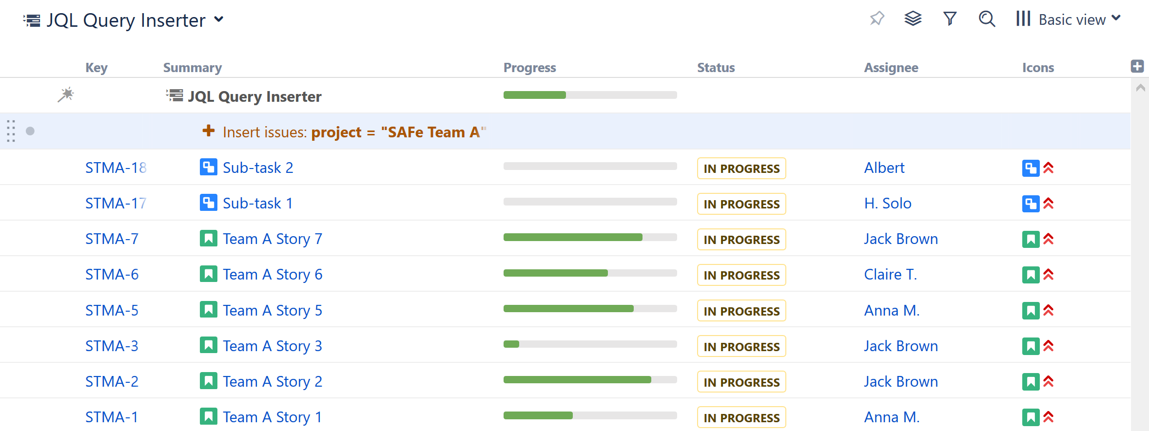 The JQL Inserter is a very powerful generator, because it allows you to set specific conditions, such as which projects should be included, what issue types, who issues are assigned to and more.
