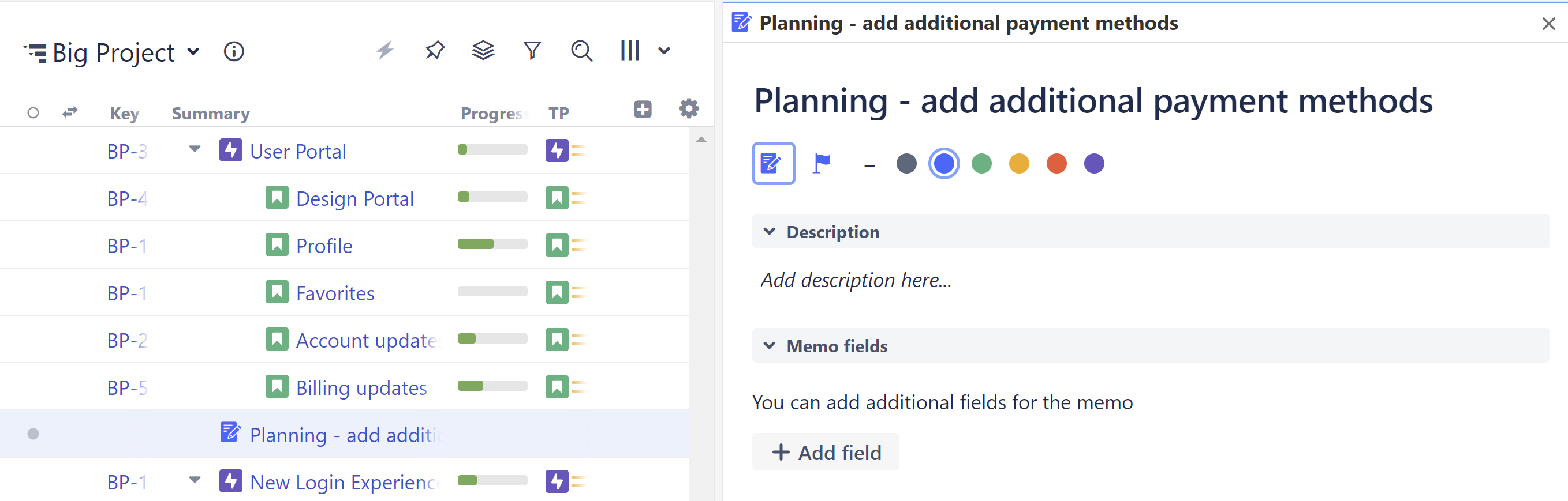 - Create non-Jira tasks for planning purposes. You can give a memo an assignee, due date, and time tracking details, and aggregate that data alongside Jira data.