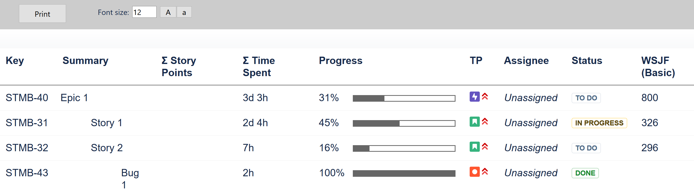 - The Summary column on the printable page displays only the summary field, without the issue description or icons. If you’d like to print the descriptions, add a separate Description column to the structure.