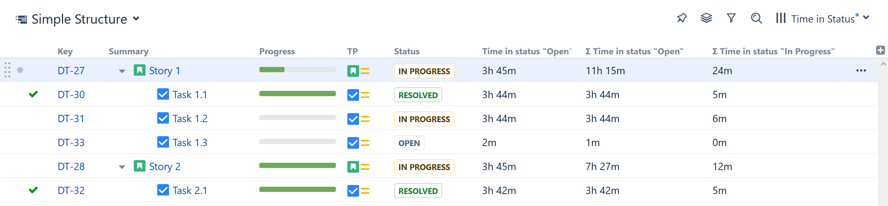 The new Time in Status column is based on issue history data, so the values can be quite expensive to calculate. Our performance tests have shown that in the aggregate mode, it can be visibly slower than simple field-based columns in structures of 10,000 issues or more. If you are planning to use this column with large, deeply-nested structures, we advise that you check its performance on a staging system.