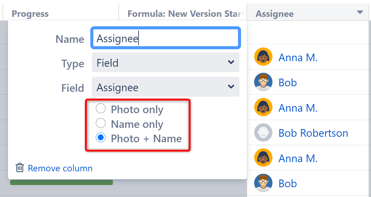 It is now possible to choose whether user fields (Assignee, Creator, Reporter, custom user-picker fields) show the user's name, photo (avatar) or both.