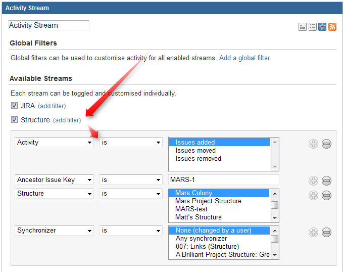 It is possible however, if you use a complex search query on a JIRA instance with large history of structure changes, that querying database will take longer time than Activity Streams allows and you will not see any results. (There should be a message that "one of the activity streams providers took long time to provide an answer".)