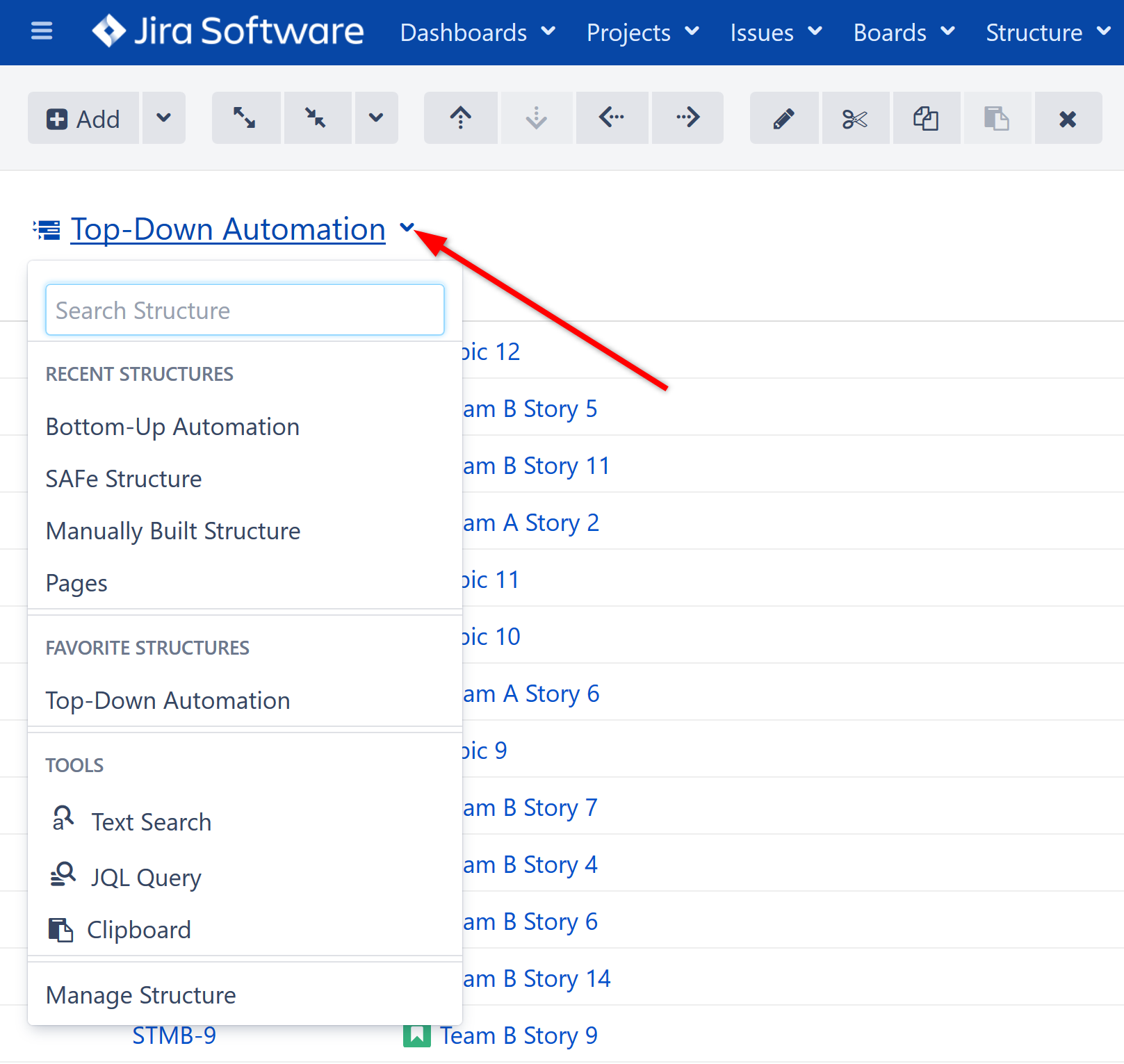 Apart from choosing structures, you can also use this drop-down to run text and JQL searches, see the clipboard contents and - if you have Structure.Pages installed - search for Confluence pages. All of these options are available under the Tools section of the menu, when using Structure Board or Structure on the Project Page