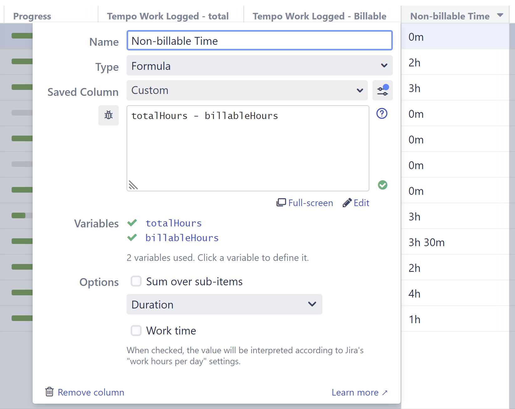 When mapping a variable to Tempo Work Logged, you can specify the same values as in the Tempo Work Logged Column. In the example above, we used identical settings for both variables, except that for "billableHours" we checked the "Billable hours" option.