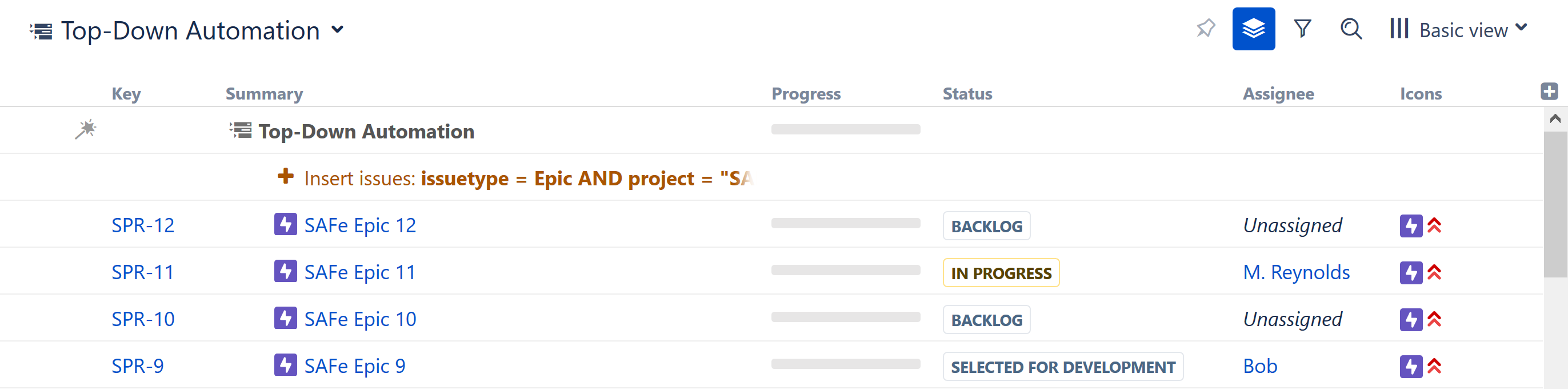 Once you click Apply, the Insert generator will pull all issues that match your query into your new structure. In this case, they will add the Epics from our specified project.
