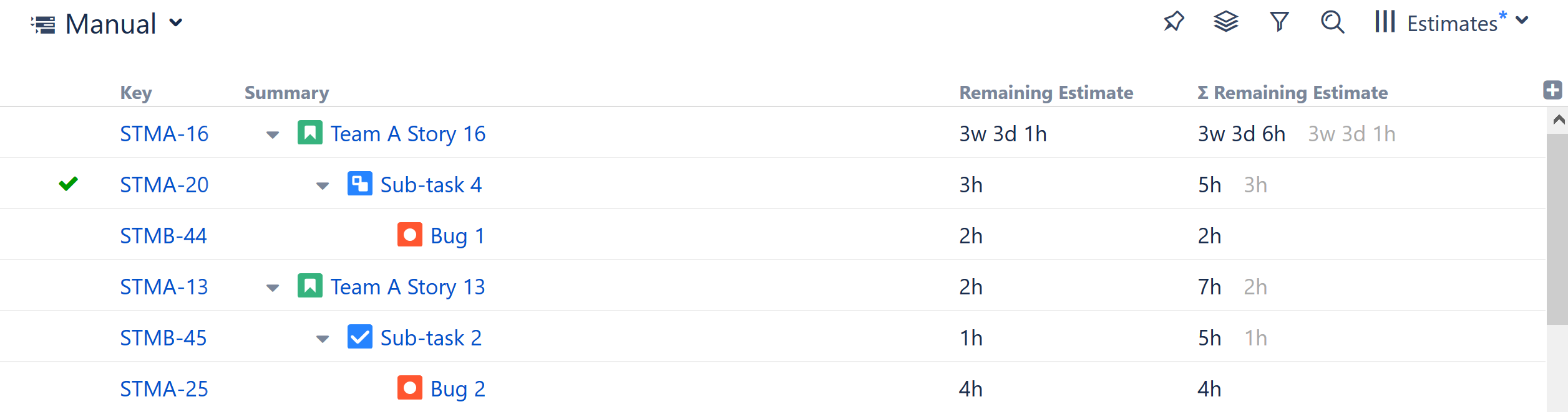 - When an aggregate value is displayed for an issue that also has its own value in the field, its own value is displayed next to the aggregate value in a gray color.