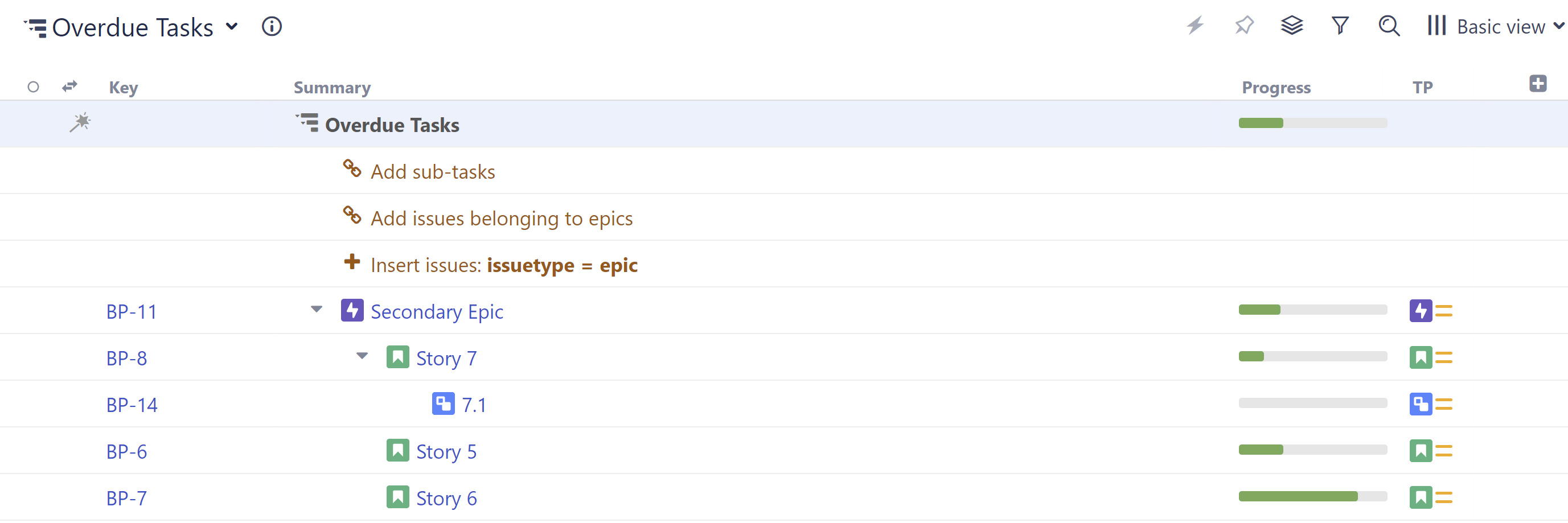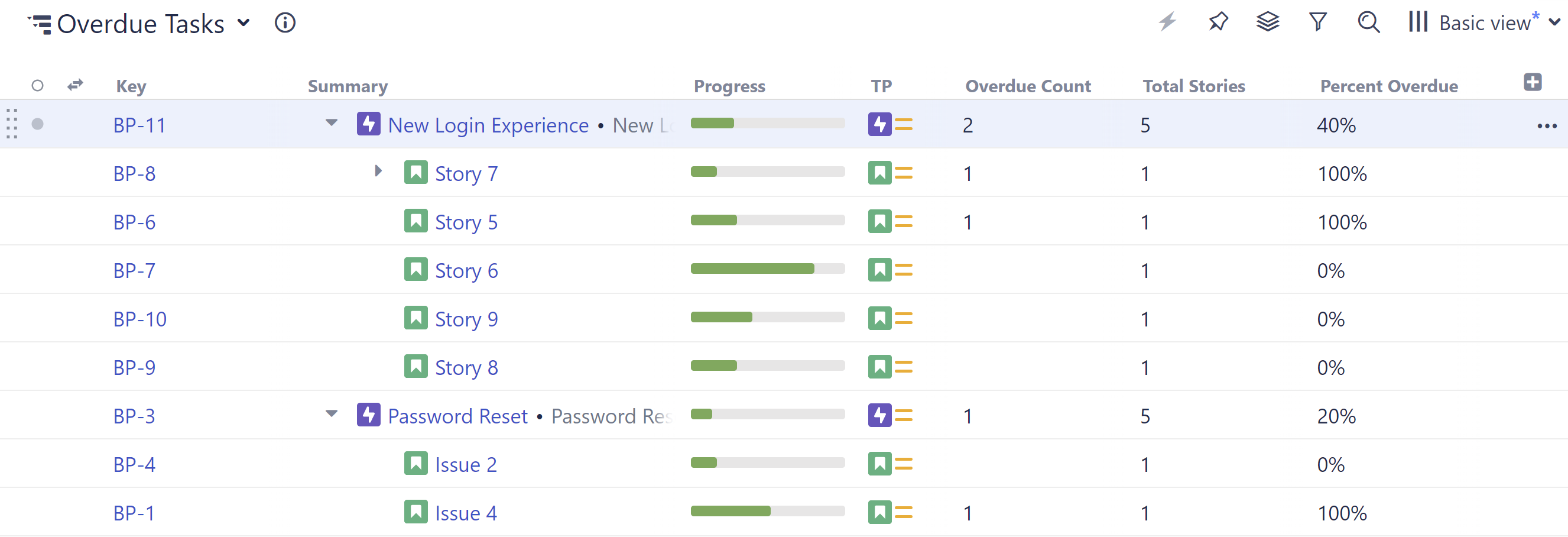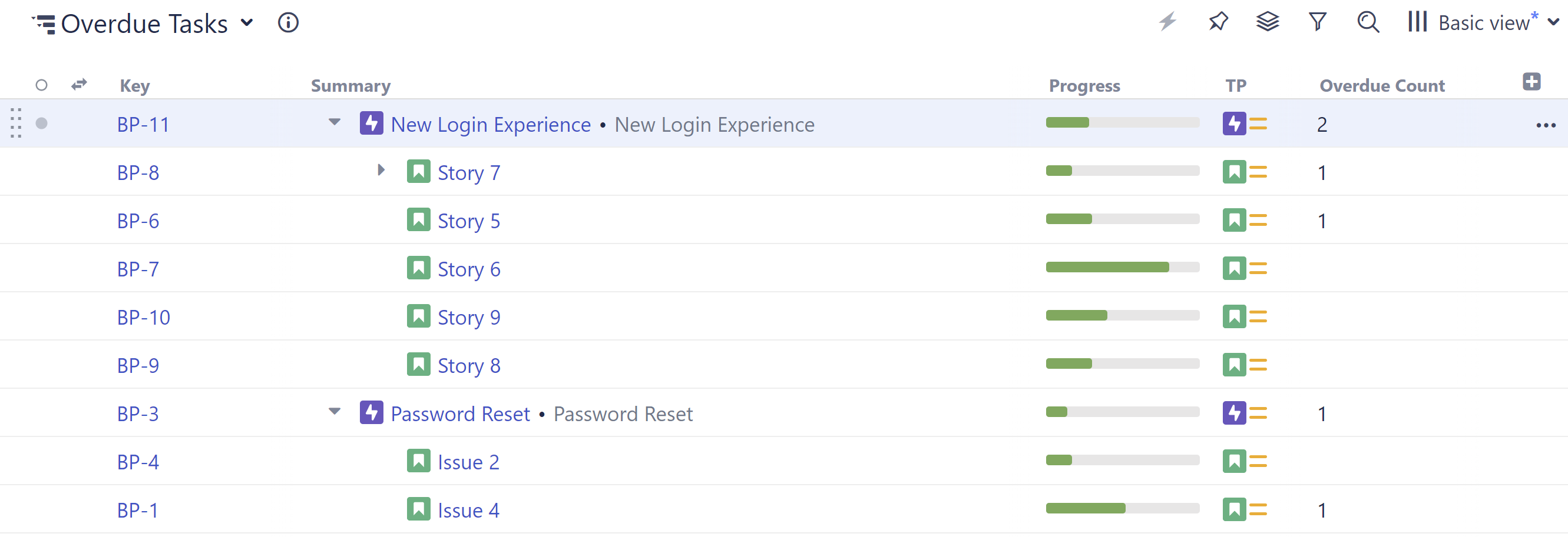 IF(type= "Story" andstatus!= "Done" and parent{due_date} < today(); "overdue")Aggregate overdue items for epics (we'll cover this next!)