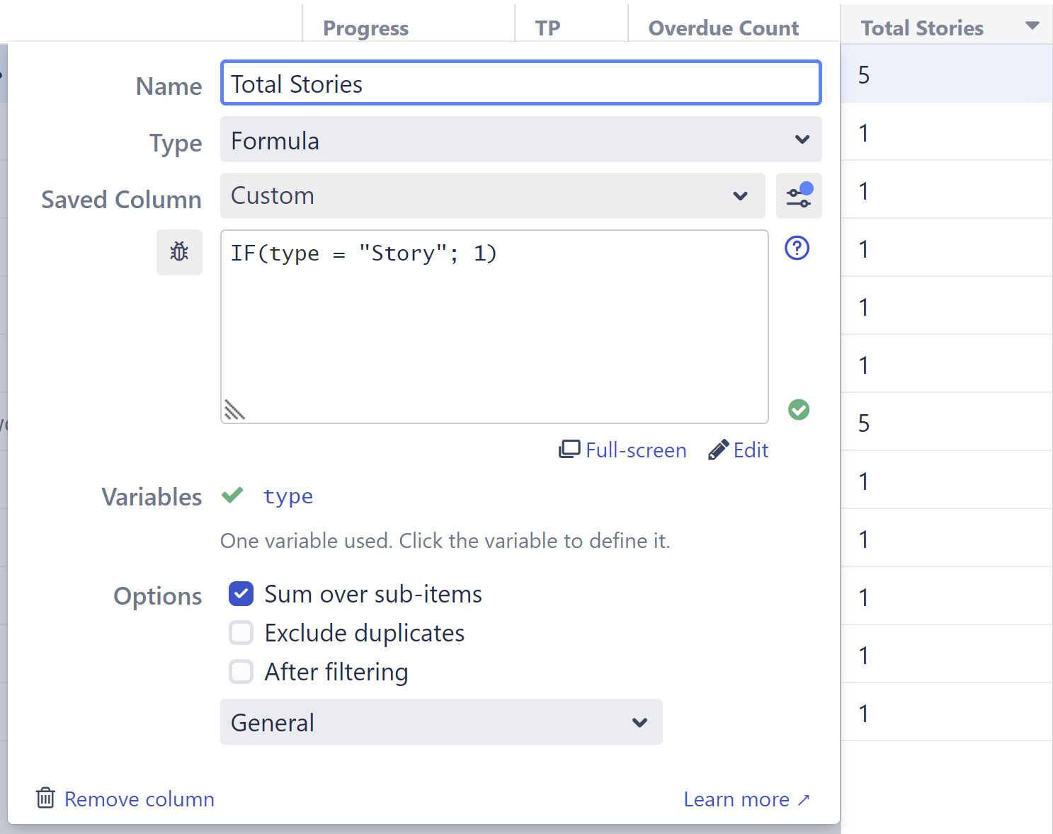 IF(type = "Story"; 1)Check the Sum over sub-item box
