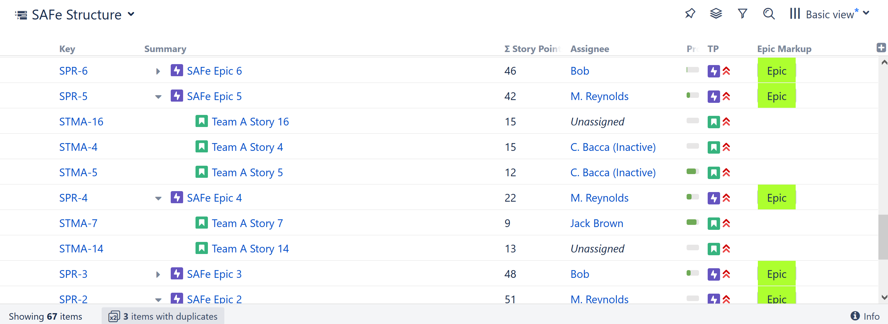 CASE(project, "SAFe Program", "(*b)", "SAFe Team A", "(*y)", "SAFe Team B", "(*r)", "Marketing", "(*g)")