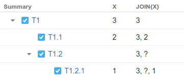 If the current row has children and the #subtree modifier is set, join appends the values for children, wrapping them into characters (braces by default).