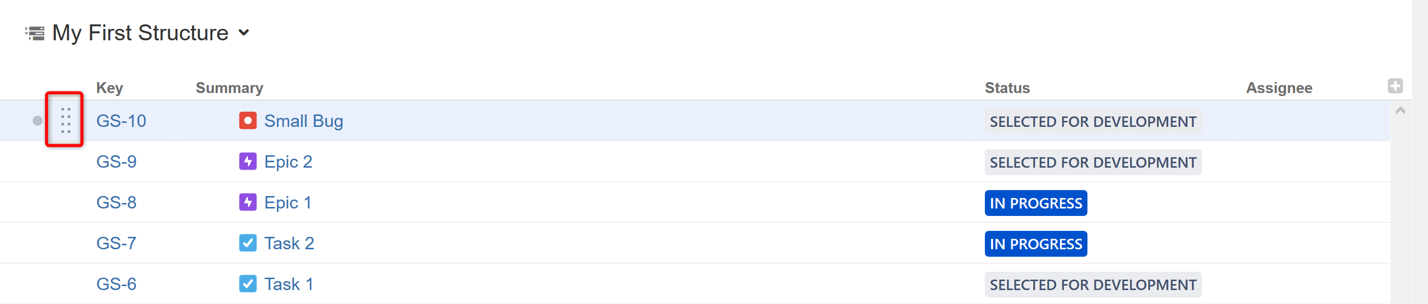 To grab an item, move your mouse pointer over the Drag and Drop Handle at the far left of the item's row. Press and hold the handle as you move the work item to its new location.
