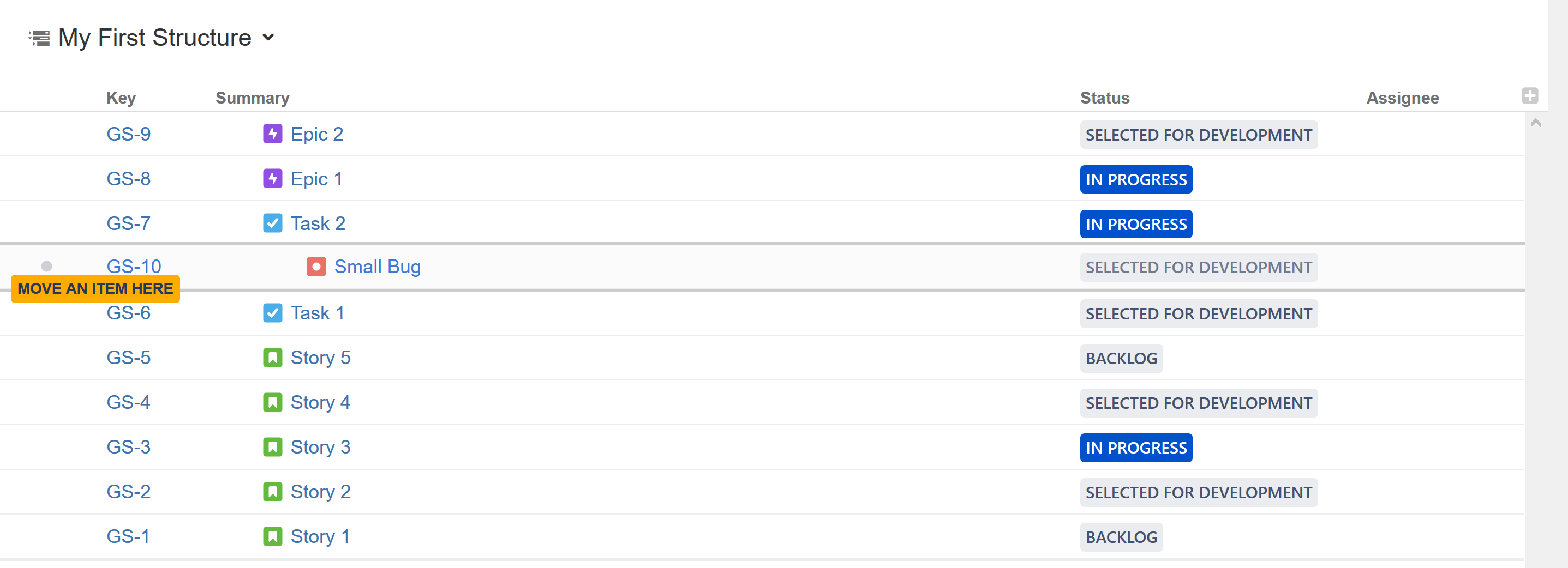 In the example below, we are moving the work item Small Bug to the right, so it will become a child of Task 2.