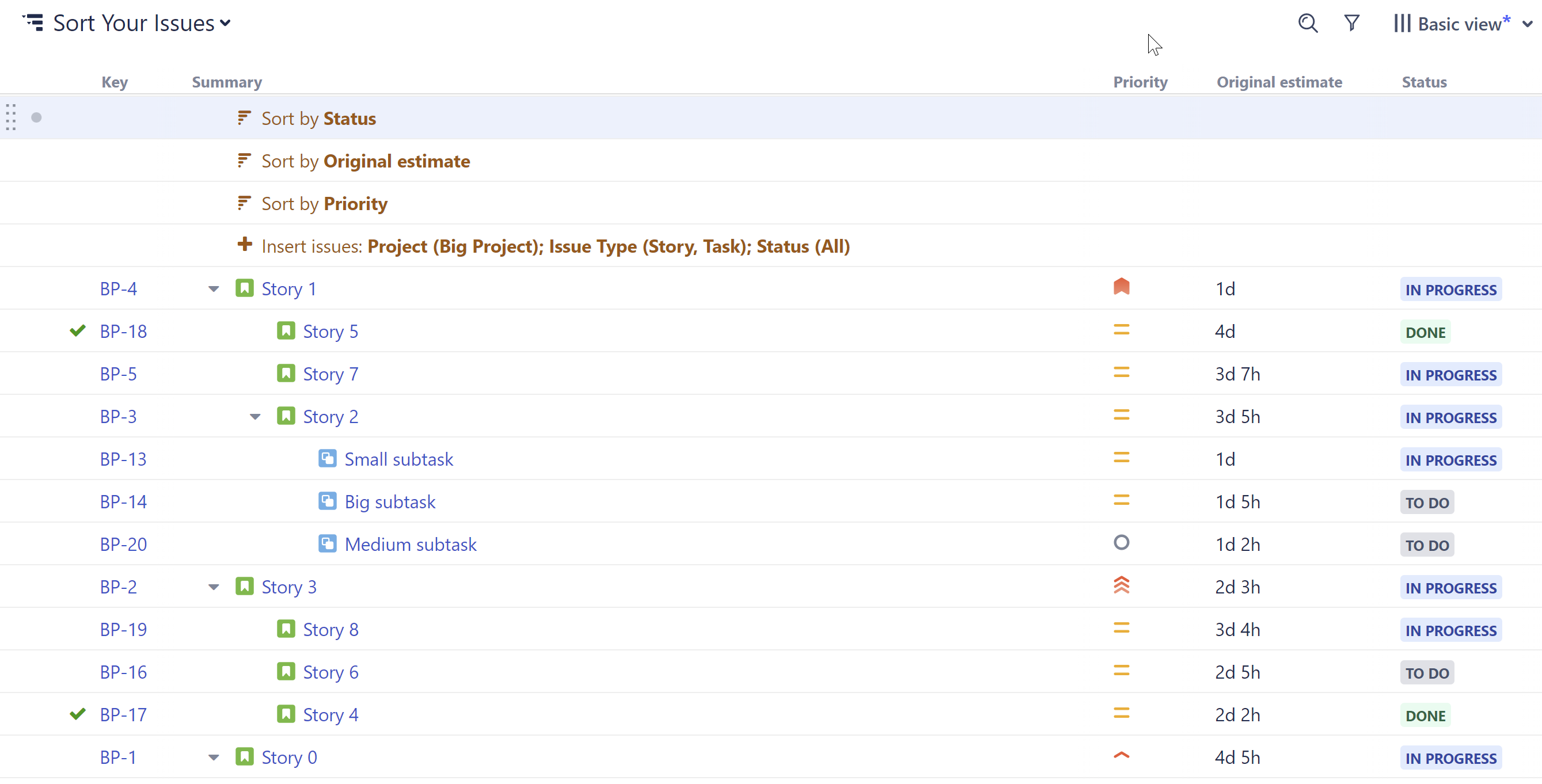 Sort by Original Estimate, Sort Levels from 2 to 2. Level 2 is one level down from the generator, so our blockers have been sorted by original estimate.