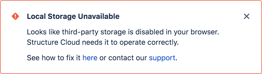 If you see the notification that local storage is unavailable, it most likely means your browser is configured to block third-party storage. Please follow the appropriate instructions on how to enable third-party storage for Structure Cloud.