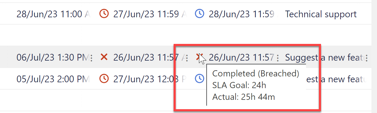 "Time to..." columns include icons which provide at-a-glance information about each ticket's timeline and SLAs:
