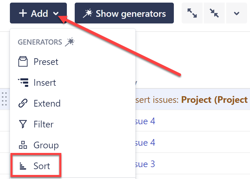To add a Sort by Formula generator, open the Add menu and select Sort.