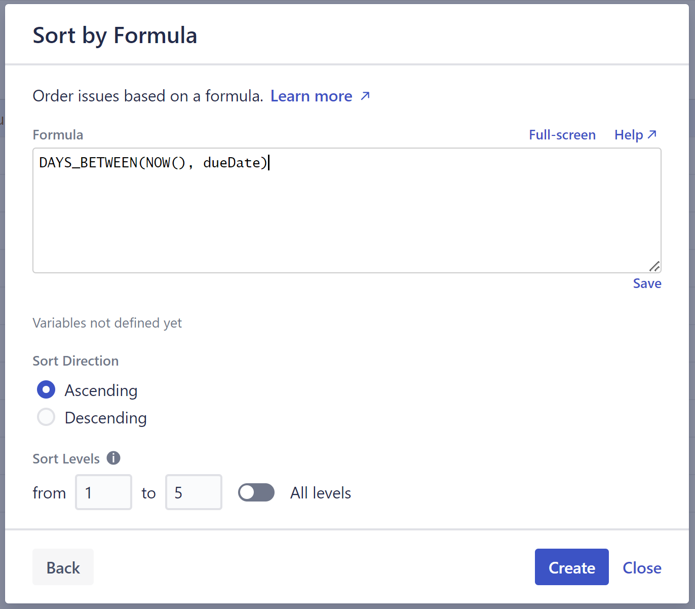 The structure above sorts work items by the number of days until they are due, using the simple formula: DAYS_BETWEEN(NOW(), dueDate)
