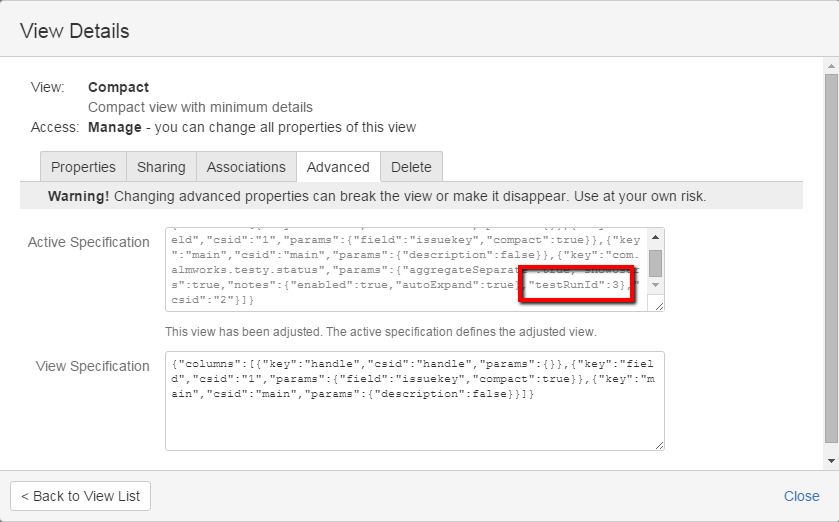 - Find the Test Run ID. To do that, open the View drop-down menu and select Manage Views. Mouse over the view name and select Details | Advanced | Active Specification.
