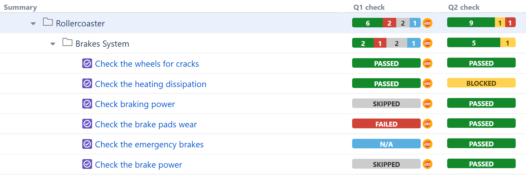 By default, a group issue or folder's test result is displayed as a distribution of its children's results (see first column below). You may choose to display it as a single result (see second column) by unchecking the Show numbers option.