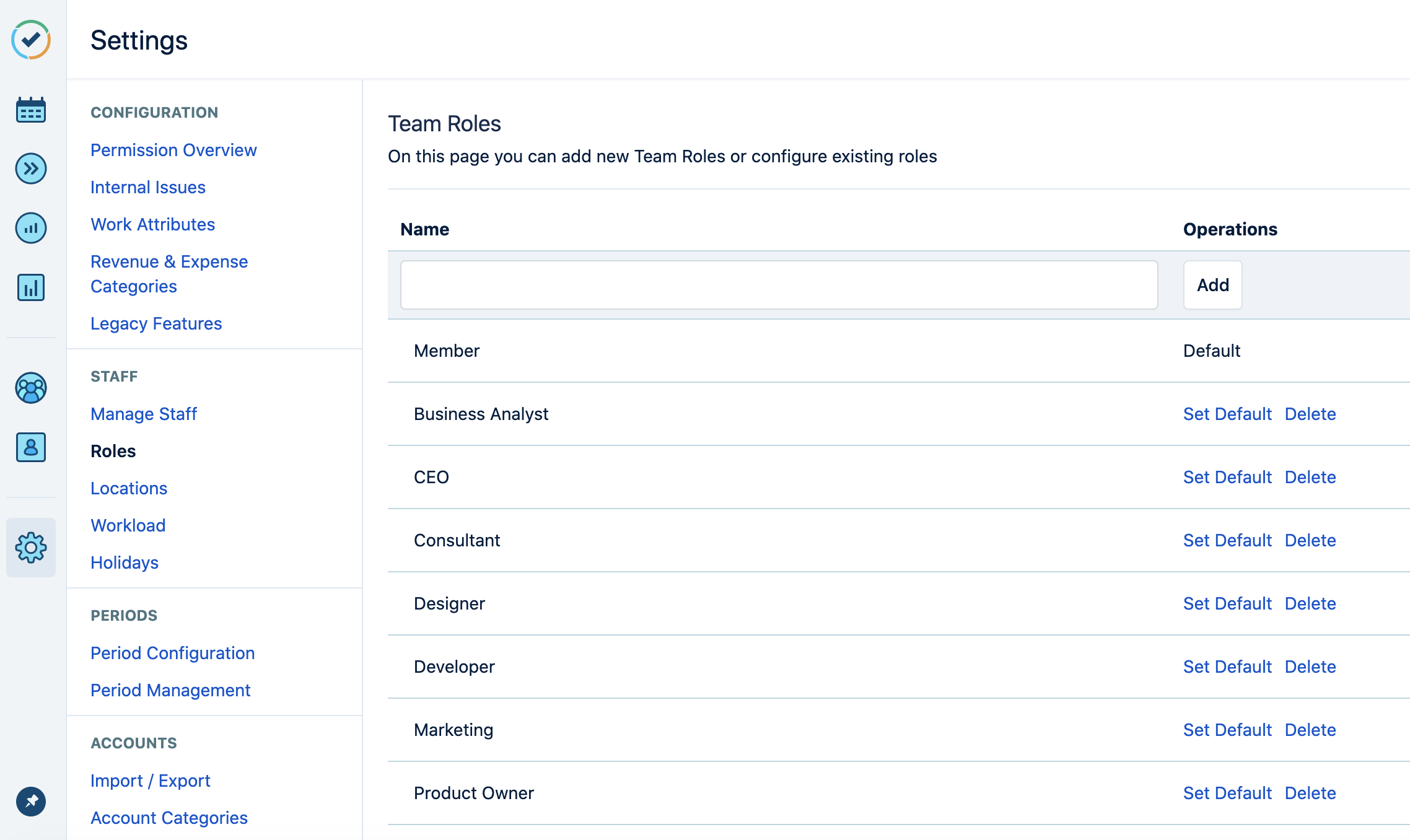 Under Staff, select Roles. (To access this in older versions of Tempo Server, go to Teams in the sidebar and then select Team Roles.)